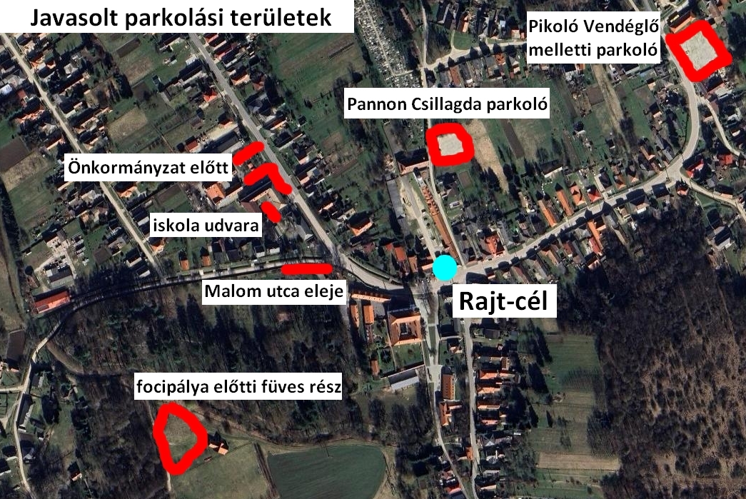 A legjobb, ha a Pikoló Vendéglő melletti nagyparkolót használjátok, itt nagy terület áll rendelkezésre (kb. 50 autó) és a rajt-cél csak 400 méterre van. Emellett a Pannon Csillagda parkolója (kb. 15 autó) és az Önkormányzat előtti parkoló (kb. 17 autó) ajánlott.